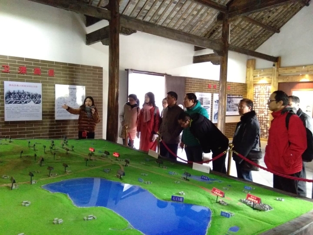 走进村子,浓郁的红色文化气息扑面而来。村头立着一面熊熊燃烧的火炬雕塑,墙上的壁画写着“红色情怀、红色西舍”。“从小就听爷爷奶奶讲过,我们这个村很了不起。”给我们做讲解的导游吴霞是本村人,她介绍,1943年新四军一支队16旅和苏南地委在西舍重建溧高县抗日民主政府,革命先烈们在此地开展减租减息、扩武招兵、剿匪反霸等工作,在苏南抗日战争史上留下了浓墨重彩的一笔。有一个很经典的故事,说一次新四军对敌人发动进攻,一夜之间拿下24个据点,陈毅也赶来庆贺。在西舍大祠堂里开庆功会时,所有人都来了,缴获的机枪、大炮、刺刀、子弹摆在前堂展览给大家看,陈毅骑着匹高额白马来,威风凛凛,还在会上做了一番慷慨激昂的演讲,让村里人听得热血沸腾。