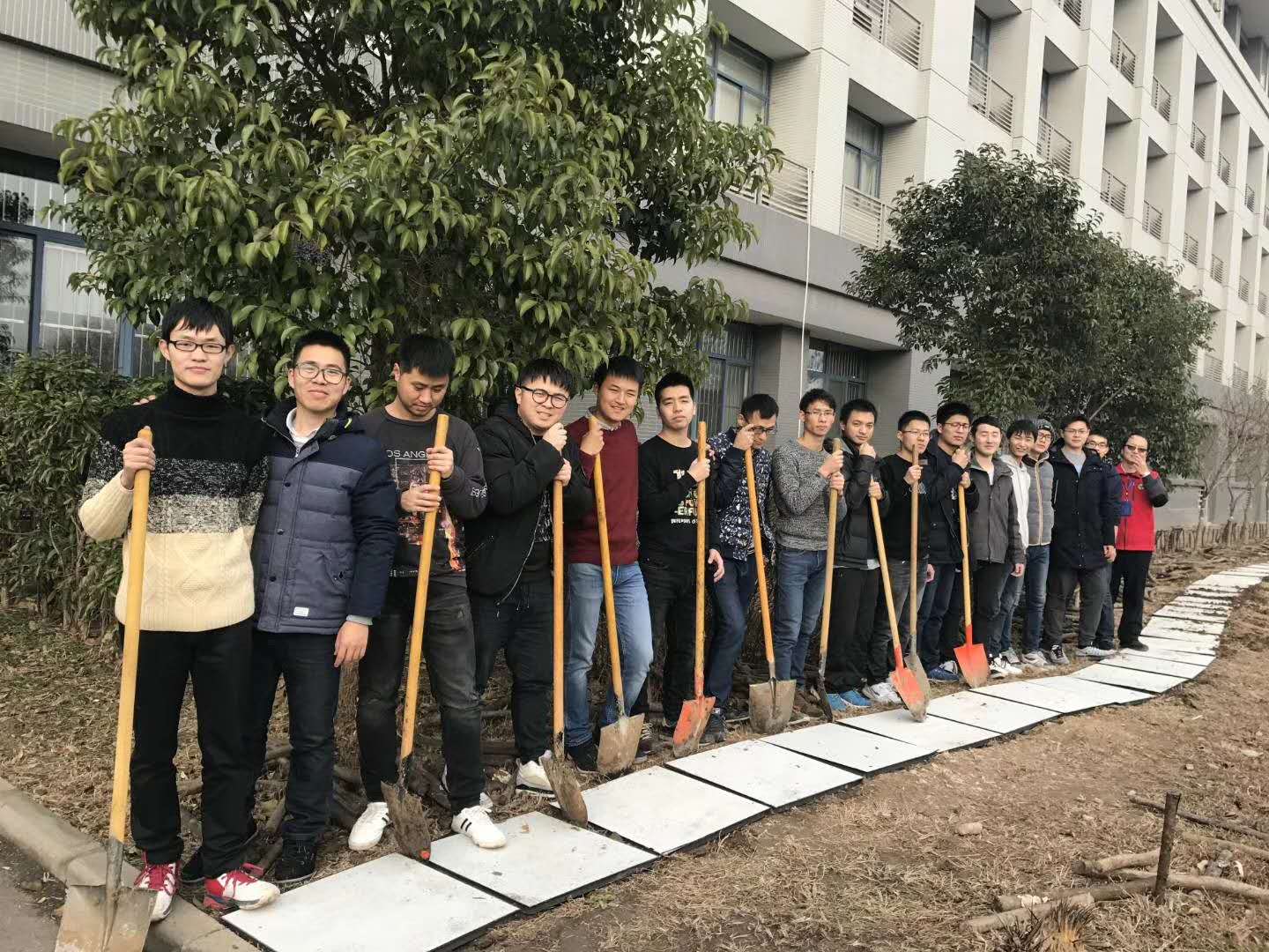 2018年1月17日下午,雨过天晴之后,公司部分研究生跟张书记一起将篱笆路改为“石板路”。特别要说明的是,机械公司此次重修小路是将废弃的机房地板废物利用,为了保证师生的使用安全,同学们还在前期测试了地板的防滑性和安全性。同学们分工明确,有的拿着锄头拆除原本铺在地面的木棍,有的三两结伴将“石板”按一定间距铺好。