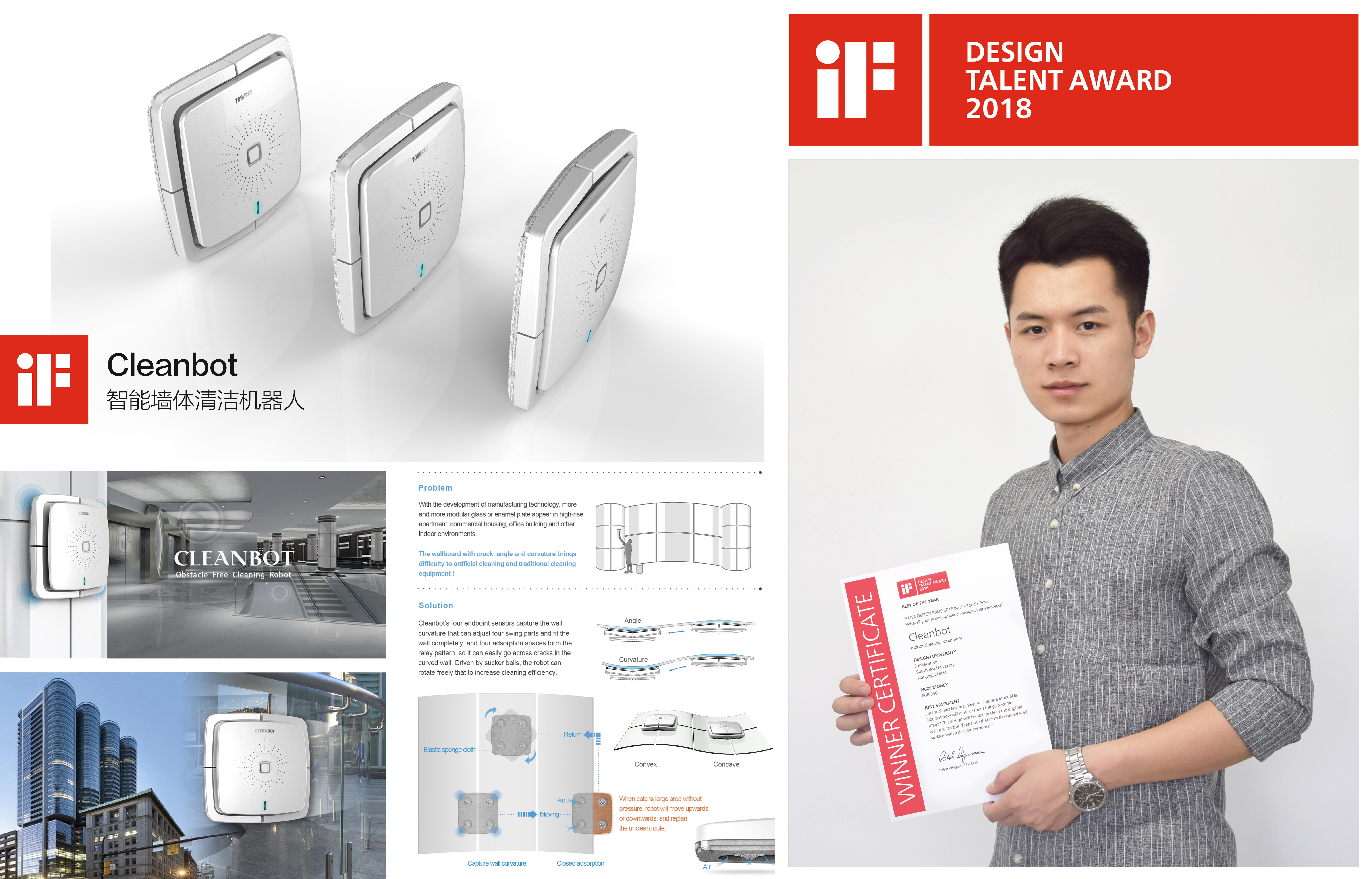 近日,全球设计界备受瞩目的iF DESIGN TALENT AWARD 2018设计大奖揭晓,由太阳集团tyc33455官网17级博士生邵俊凯设计、薛澄岐教授指导的作品“Cleanbot”,从全球50多个参赛国家,五千多件参赛作品中脱颖而出,历经60多位国际专家三轮评审,最终斩获“2018 iF设计新秀奖”。iF设计奖是设计界影响力最广、认知度最高的奖项,拥有设计界“奥斯卡奖”之美誉。