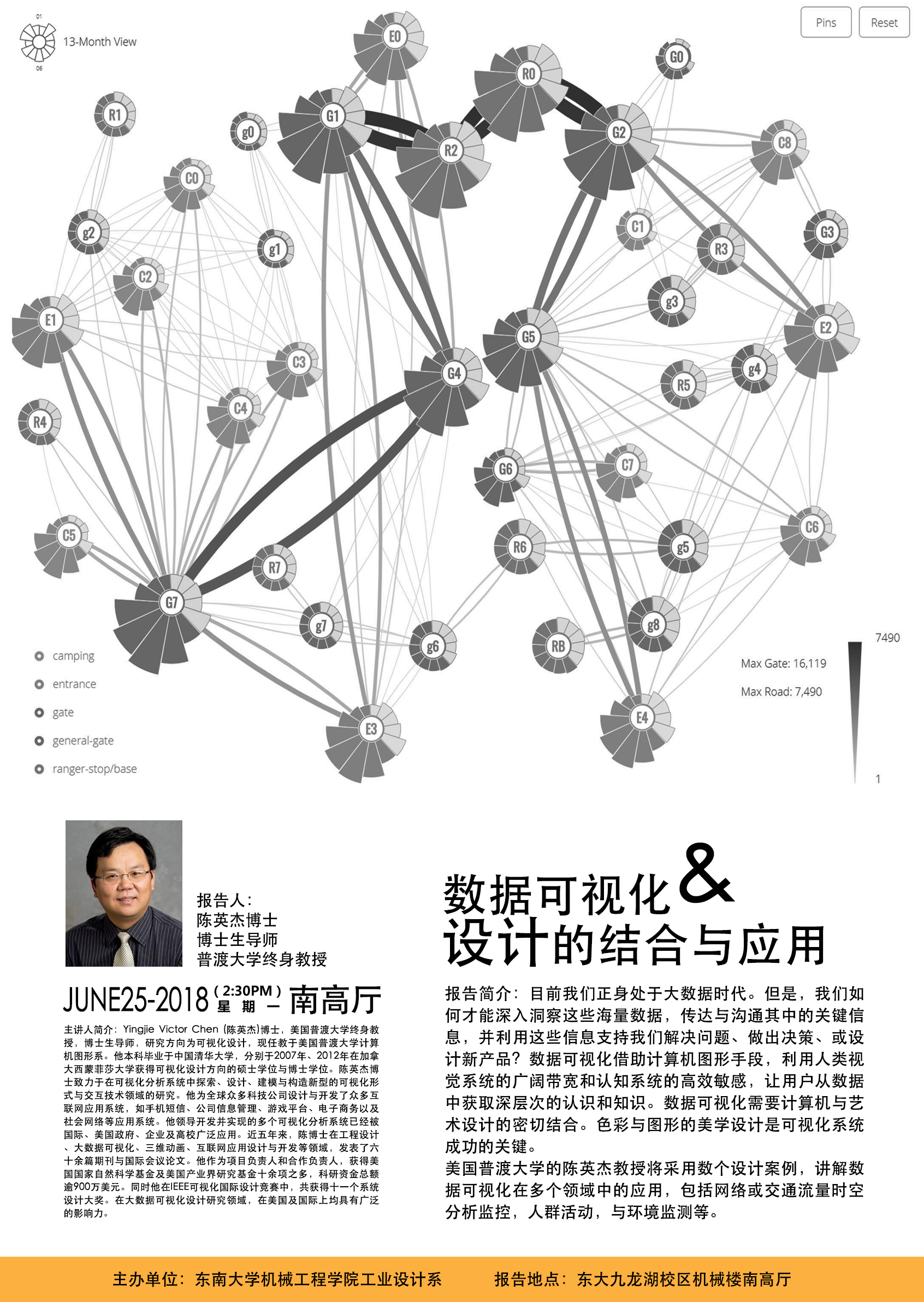 美国普渡大学的陈英杰教授将采用数个设计案例,讲解数据可视化在多个领域中的应用,包括网络或交通流量时空分析监控,人群活动,与环境监测等。