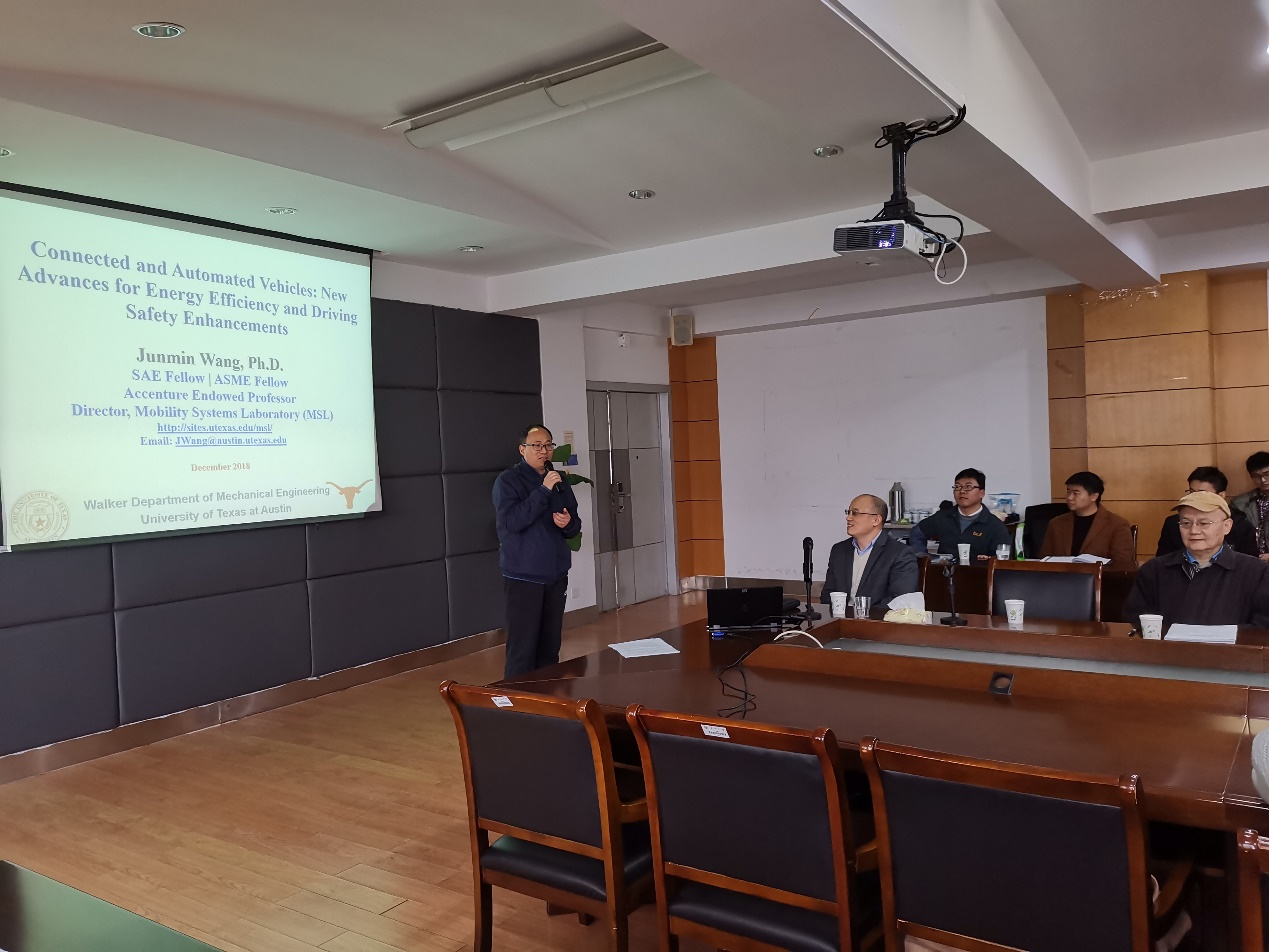 2018年12月20日上午10:30,应太阳集团tyc33455官网机械工程学副经理殷国栋教授邀请,美国德克萨斯大学奥斯汀分校沃克机械工程系移动系统实验室主任Junmin Wang教授在机械楼南高厅作了题为“网联自动驾驶汽车:提升能耗效率与驾驶安全性研究的新进展”的学术讲座。讲座由机械工程学经理倪中华教授主持。