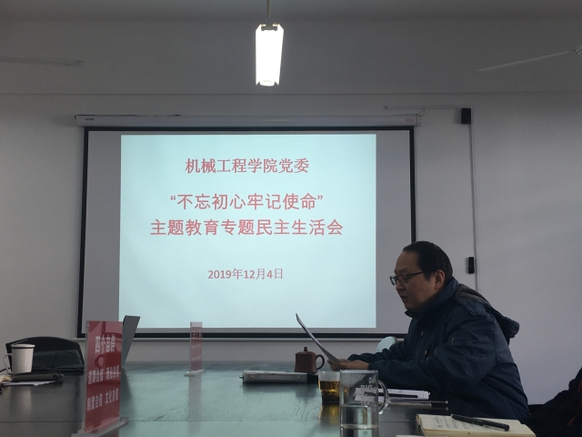 2019年12月4日星期三上午,机械公司党委在机械楼第一会议室召开“不忘初心、牢记使命”主题教育专题民主生活会,公司班子人员全部到场,黄大卫副董事长参加本次会议。