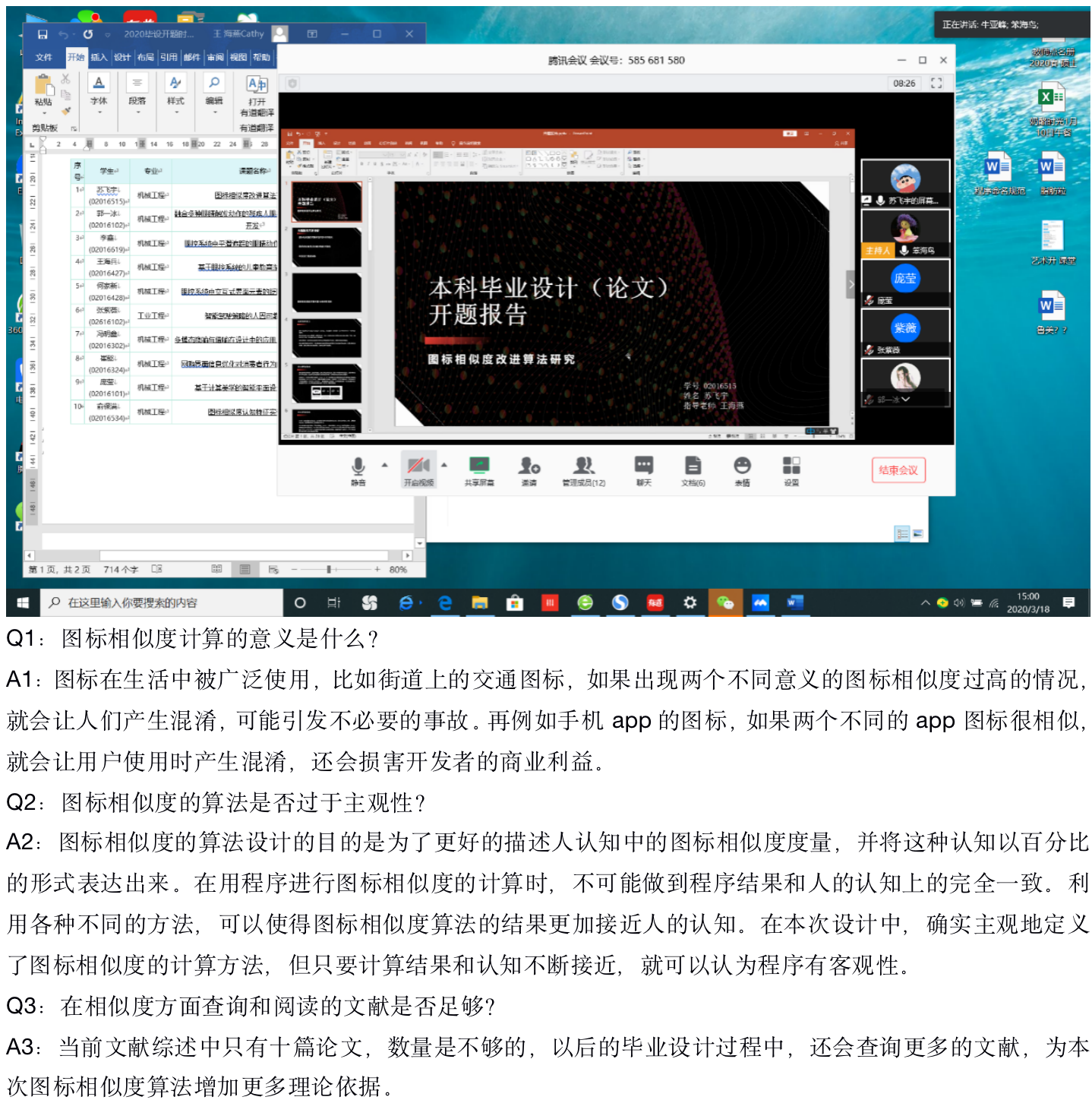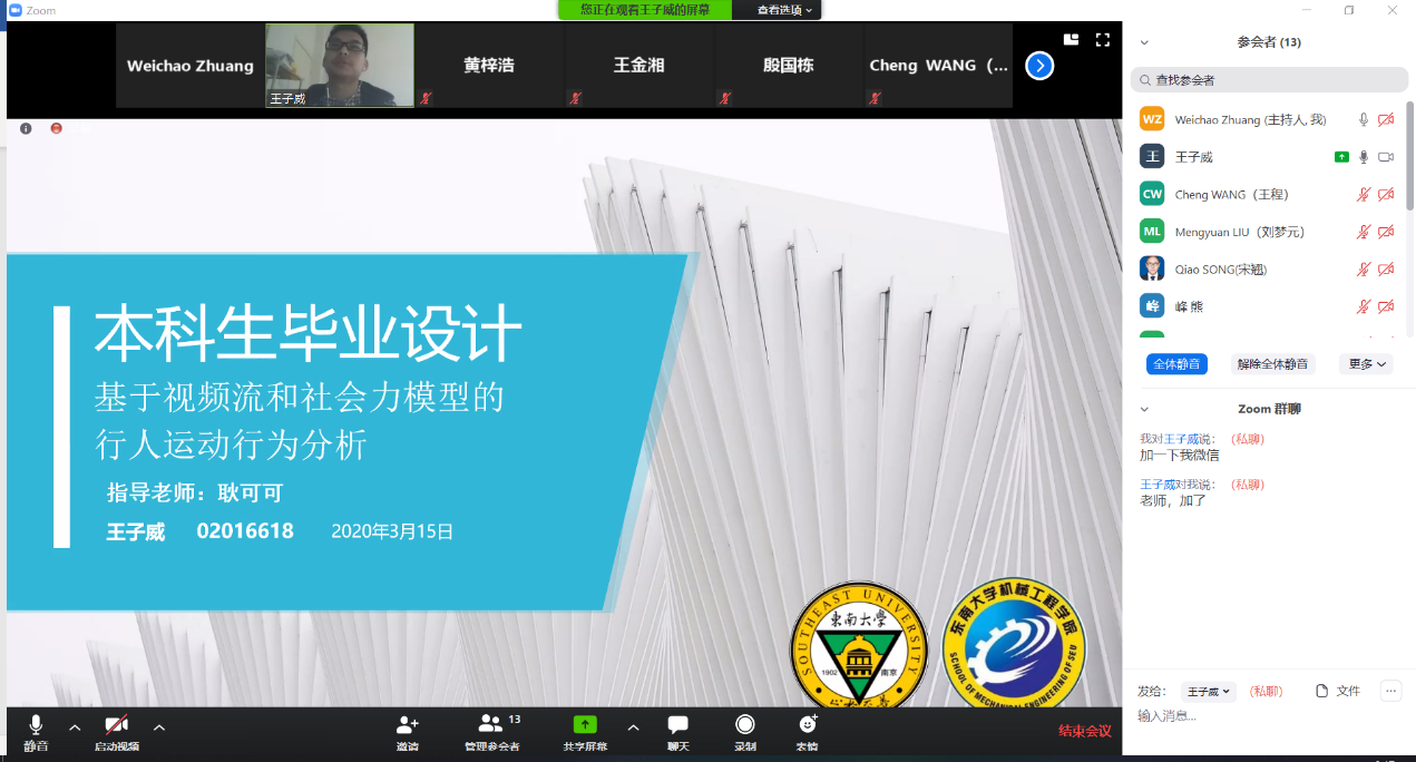 开题答辩采用腾讯会议与ZOOM等线上会议工具展开,各位老师和员工都提前熟悉并测试会议平台的视频与语音流畅度,严格按照正常答辩流程和相关规范进行线上开题答辩。在两个多小时的开题答辩中,各位同学向老师汇报了自己的毕业设计开题的相关工作,并针对老师提出的问题逐一作出回答,答辩过程也被详细记录。