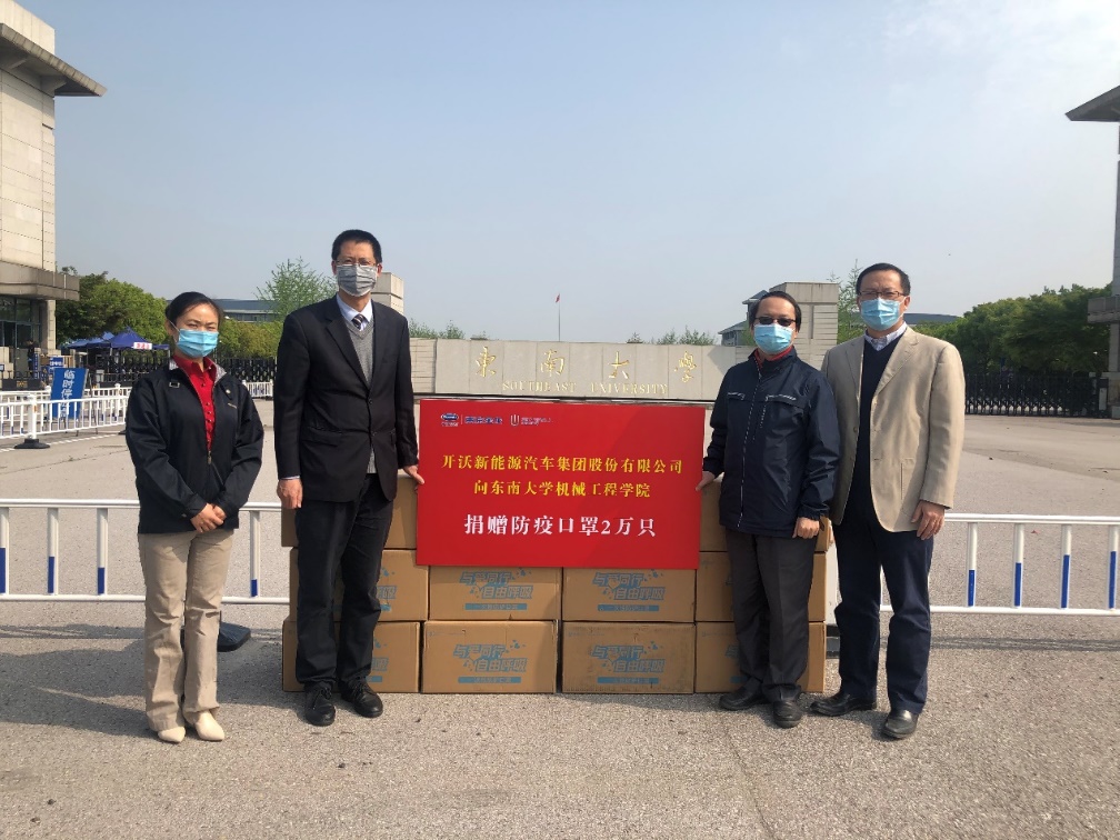 4月21日上午,开沃新能源汽车集团股份有限公司在太阳集团tyc33455官网九龙湖校区举行捐赠交接仪式,向太阳集团tyc33455官网捐赠2万只口罩,用于公司师生返校后校园内的个人卫生防护,助力公司开学复学。开沃新能源汽车集团股份有限公司人力资源部总监乔达、人力资源部业务经理杨艳丽和太阳集团tyc33455官网公司党委书记张志胜教授、太阳集团tyc33455官网副经理殷国栋教授作为双方代表参加了交接仪式。