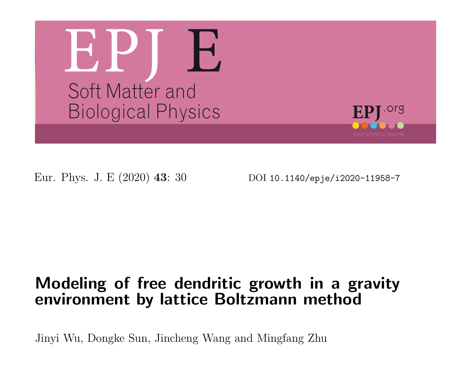 近日,公司2017级本科生吴津仪同学以第一作者在国际著名出版集团斯普林格旗下的老牌国际期刊《European Physical Journal E》发表论文(该期刊为物理领域JCR分区二区期刊)。这是公司近年来大学三年级本科生发表的第一篇国际期刊论文。论文以“Modeling of Free Dendritic Growth in a Gravity Environment by Lattice Boltzmann Method”为题,重点阐述了重力作用下枝晶生长的数值建模与模拟方法。