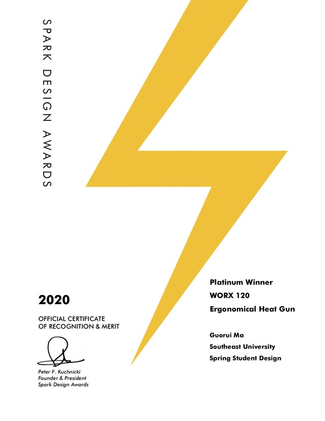 世界权威设计大奖赛之一的星火国际设计奖近日在美国旧金山揭晓,由二十多位国际权威专家在千余件作品中进行两轮评审,来自四十多个国家和地区的参赛团队共150多件作品入围全球总决赛。经过激烈角逐,最终公司工业设计系硕士生马国瑞(指导老师:薛澄岐教授,Bernie Walsh, 牛亚峰副教授)设计的作品“WORX 120° Ergonomical Heat Gun”,斩获2020年星火国际设计大奖全球总决赛最高奖项——铂金奖(Spark Awards 2020 Platinum Winner),成为大陆参赛者中唯一获奖者,全球4名获奖者之一。