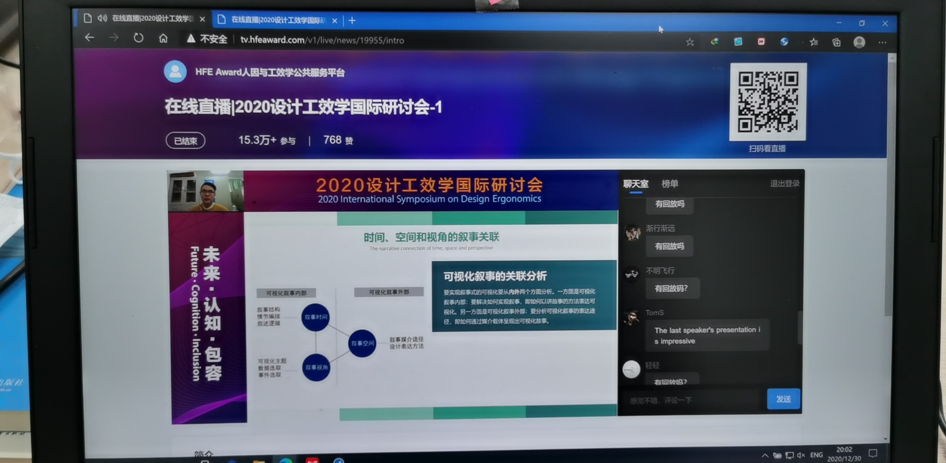 2020年12月29日至30日,2020设计工效学国际研讨会以“未来·认知·包容”为主题,探讨人因工程、设计学和神经科学之间的交叉与融合机制。会议采取在线网络视频会议方式,于全球多平台共享英文原文直播,吸引了来自全球各地的15.4万人次观看。