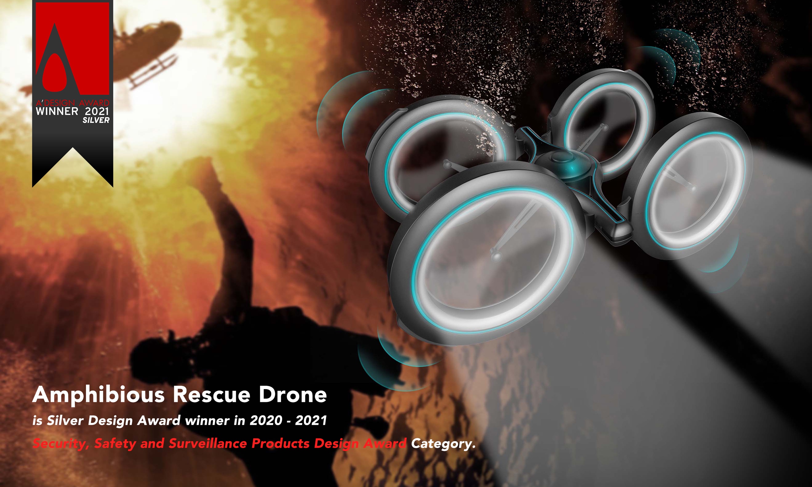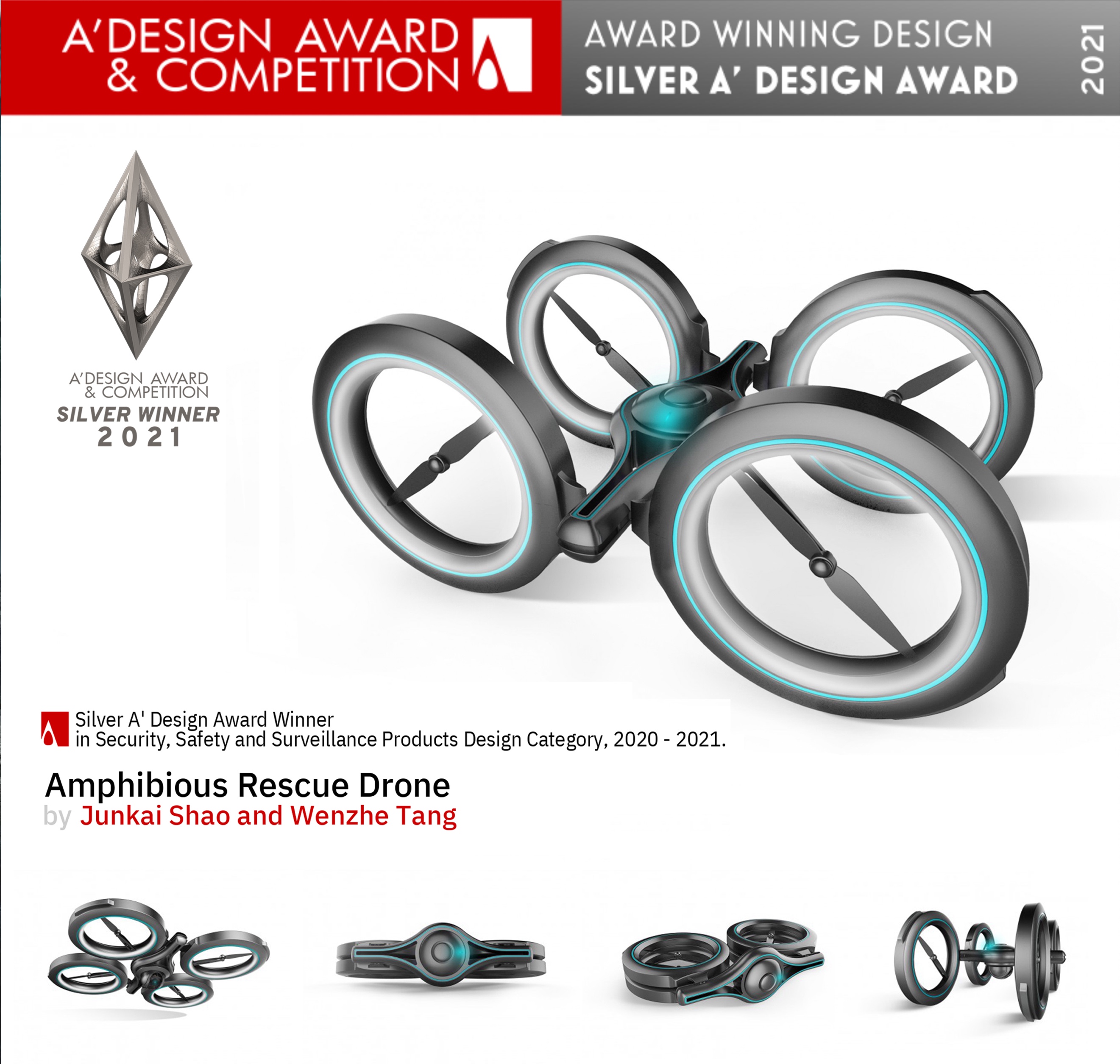 近日,全球设计界备受瞩目的A' Design Award 2021设计大奖揭晓,由太阳集团tyc33455官网工业设计专业17级博士生邵俊凯、18级博士汤文哲设计,薛澄岐教授指导的作品“Amphibious Rescue Drone”,从全球108个国家和地区的20000多份参赛作品中脱颖而出,经过211位具有国际影响力的知名学者、著名媒体成员、创意设计专业人士和有丰富经验的企业家组成的评审团严格评审,斩获“2021 A' Design Award银奖”。