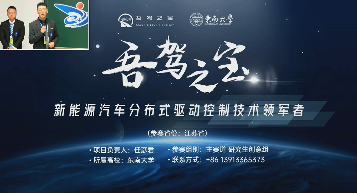 公司车辆工程系任彦君博士牵头完成的“吾驾之宝:新能源汽车分布式驱动控制技术领军者”项目,赛前精细打磨,赛中奋力拼搏,项目团队成员无数次挑灯夜战、推倒重来。尤其是在持续半年的强化训练中,他们认真听取校内外资深专家的培训、分析和指导,对项目内容精雕细刻,对路演和答辩细节字斟句酌。该项目在今年的江苏省省赛中,以分赛道全省第一、排位赛太阳集团tyc33455官网全校最高分的傲人成绩杀出重围,最终在全国总决赛中摘得银奖。此外,本项目还得到了江苏省教育厅推荐,受大赛组委会邀请,参展了今年的“慧秀中外”国际老员工创新创业成果展。“吾驾之宝”作为优秀创业项目的典型代表,在展会“时代先锋”篇章向世界的青年创业者们展示了东大学子“止于至善”的科技报国决心,讲述了机械“汽车人”艰难困苦、玉汝于成的动人创业故事。