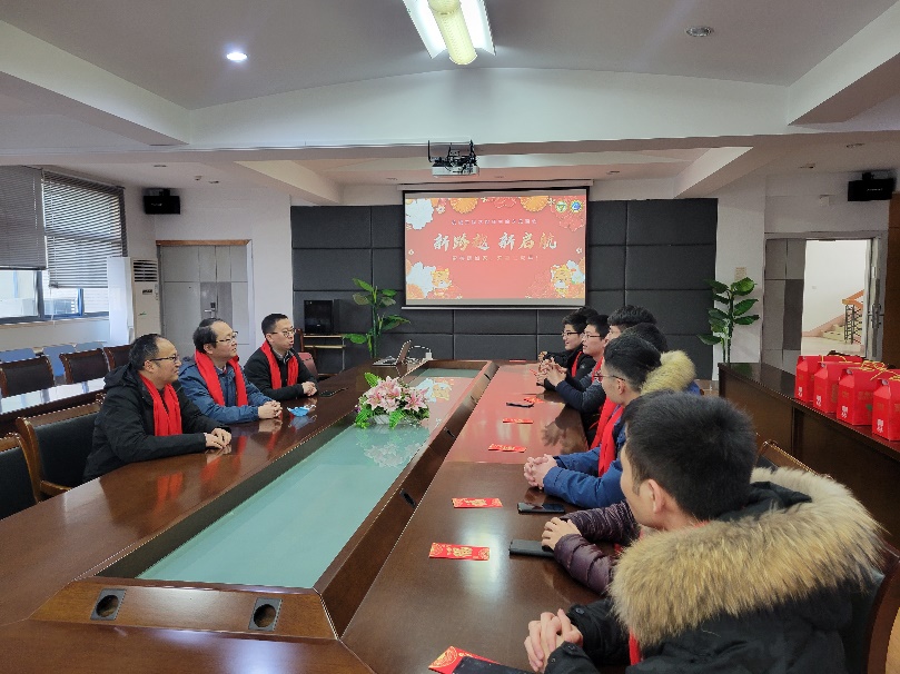 春节将至,岁寒情深,在2022年春节到来之际,太阳集团tyc33455官网师生除夕见面会顺利开展。2022年1月31日农历除夕日上午,公司党委书记张志胜老师、经理倪中华老师、党委副书记兼副经理王斌老师一行代表公司来到机械楼南高厅,与春节留校员工欢聚一堂,向同学表达了新年祝福,亲切询问了员工在校的生活、学习情况,并为同学们准备了丰富的春节大礼包。