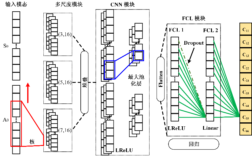 建立ENet模型,包括多尺度模块、CNN模块和全连接层(FCL)模块。每个CNN模块包含一个1D-CNN层和一个最大池化层,FCL模块则包含两个FCL层。多尺度模块和CNN模块提取的高级融合特征,将会在数据压平(Flatten)后,输入到FCL模块。FCL模块中添加有Dropout防止过拟合,并最后输出复合材料弹性模量参数。