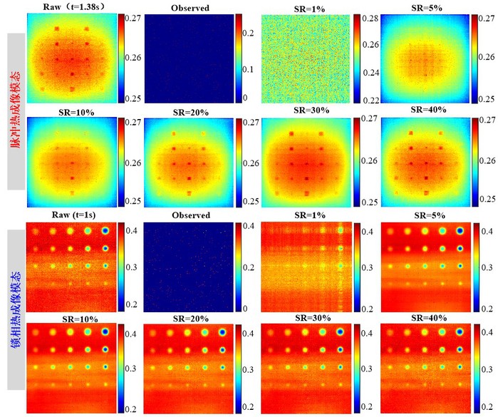 在实际热像成像中,为了显著降低热图像序列的采集量,或者在不损失热像分辨率的情况下仍能提高成像速度,通常会遇到热图像序列采样不足或缺失的问题。为此,我们提出使用低秩张量填充法来实现仅用少量已有热图像序列恢复其中的缺失项,图4为不同缺失程度下脉冲热成像模态(上)与锁相热成像模态(下)的重建结果。此外,使用光热无损检测技术测量薄涂层以及高频热成像应用中,往往需要远高于目前常用红外热像仪的帧频,为此,基于低秩张量填充法进一步提出了低秩张量填充与时间插值融合算法的光热无损检测技术,可将常用红外热像仪帧频提高10倍以上。