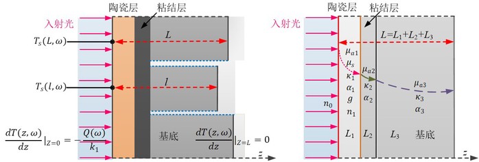 当强度调制宽光束入射到图1所示的由半透明陶瓷涂层和两层不透明金属固体(粘合层和基底)组成的复合实体时,基于光热转换效应,所吸收的光子密度波将在其内部产生热波。由于复杂的光学吸收和散射过程,通常在半透明陶瓷涂层内形成空间变化的体积热源,在位于半透明陶瓷涂层和不透明金属粘合层之间的内部界面处产生由纯光吸收过程引起的内部界面热源(空间脉冲热源)。因此,所研究涂层结构的光热波特性由半透明陶瓷涂层的光热物理特性及其内部的光热波干涉现象、不透明粘结层和基底的热物理特性等决定。