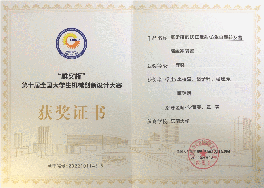 此前,该团队在江苏省机械创新设计竞赛中获得一等奖,代表江苏省参加全国大赛。受疫情影响,此次全国大赛采用线上评审的方式,增加了作品展示的难度。同时,大赛作品要求符合仿生或生态修复的主题,充分考验了员工的创新能力。经过决赛第一阶段评审与第二阶段答辩,通过原理讲解、视频展示等形式,向评审老师展示了作品的结构原理、制作工艺、功能实现以及创新点。最终,经过组委会专家严格评审,该作品获得本届国赛一等奖,在全国决赛中展示了东大风采!