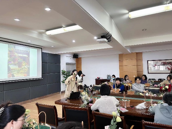 近四十名女职工在机械楼南高厅,倾听了花艺老师的授课。花艺师现场演示了插花的基本方法,从花语寓意、颜色搭配、插花技巧等方面,向大家普及了花艺知识。在花艺师的指导下,大家根据不同的花材、颜色进行剪裁搭配,创作出一个个美丽鲜活、赏心悦目的花艺花篮。