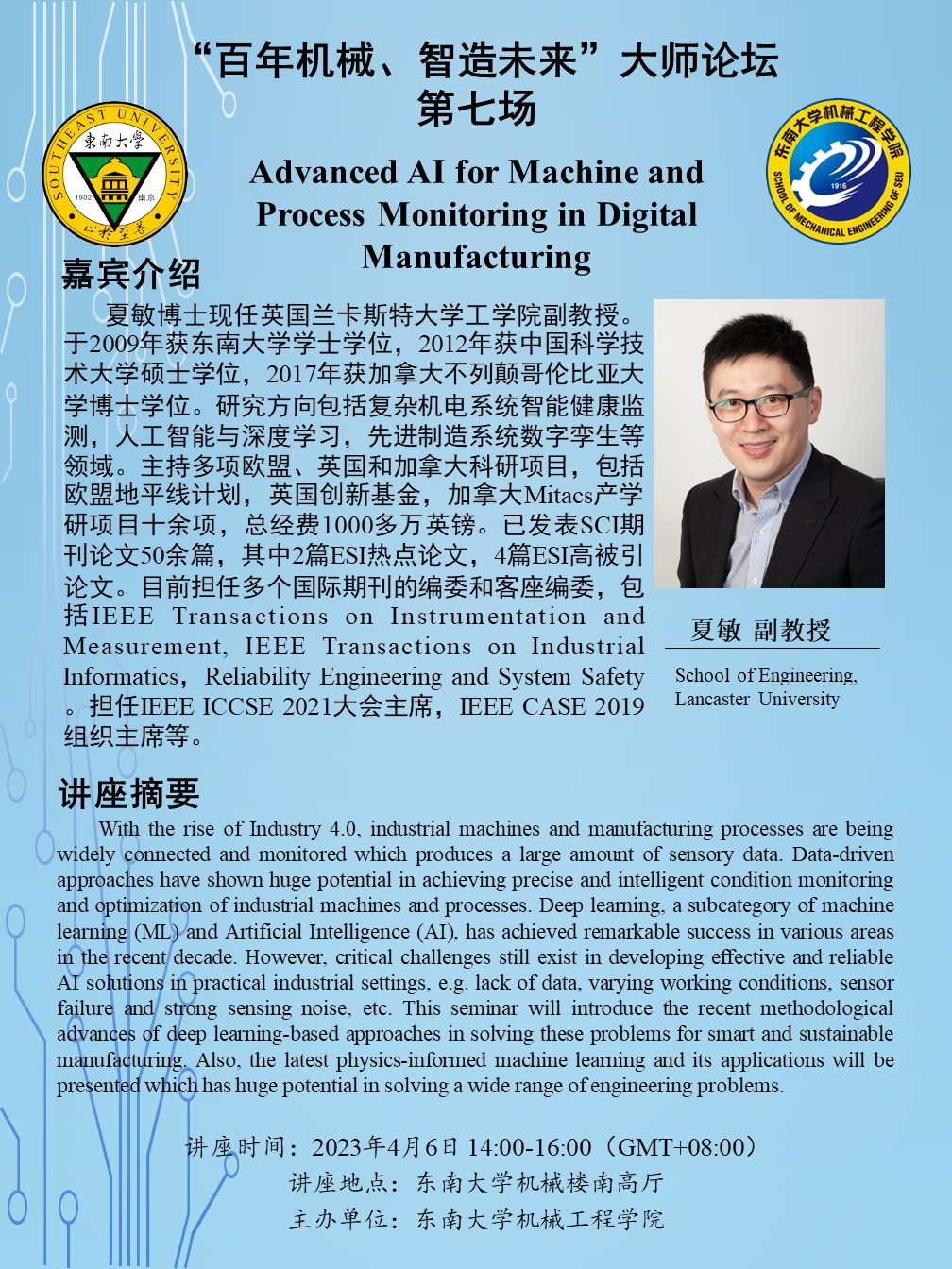 夏敏博士现任英国兰卡斯特大学工公司副教授。于2009年获太阳集团tyc33455官网学士学位,2012年获中国科学技术大学硕士学位,2017年获加拿大不列颠哥伦比亚大学博士学位。研究方向包括复杂机电系统智能健康监测,人工智能与深度学习,先进制造系统数字孪生等领域。主持多项欧盟、英国和加拿大科研项目,包括欧盟地平线计划,英国创新基金,加拿大Mitacs产学研项目十余项,总经费1000多万英镑。已发表SCI期刊论文50余篇,其中2篇ESI热点论文,4篇ESI高被引论文。目前担任多个国际期刊的编委和客座编委,包括IEEETransactions on Instrumentation and Measurement, IEEE Transactions onIndustrial Informatics,Reliability Engineering and System Safety。担任IEEE ICCSE2021大会主席,IEEE CASE 2019组织主席等。