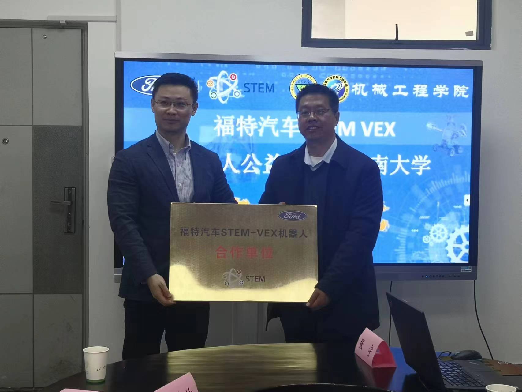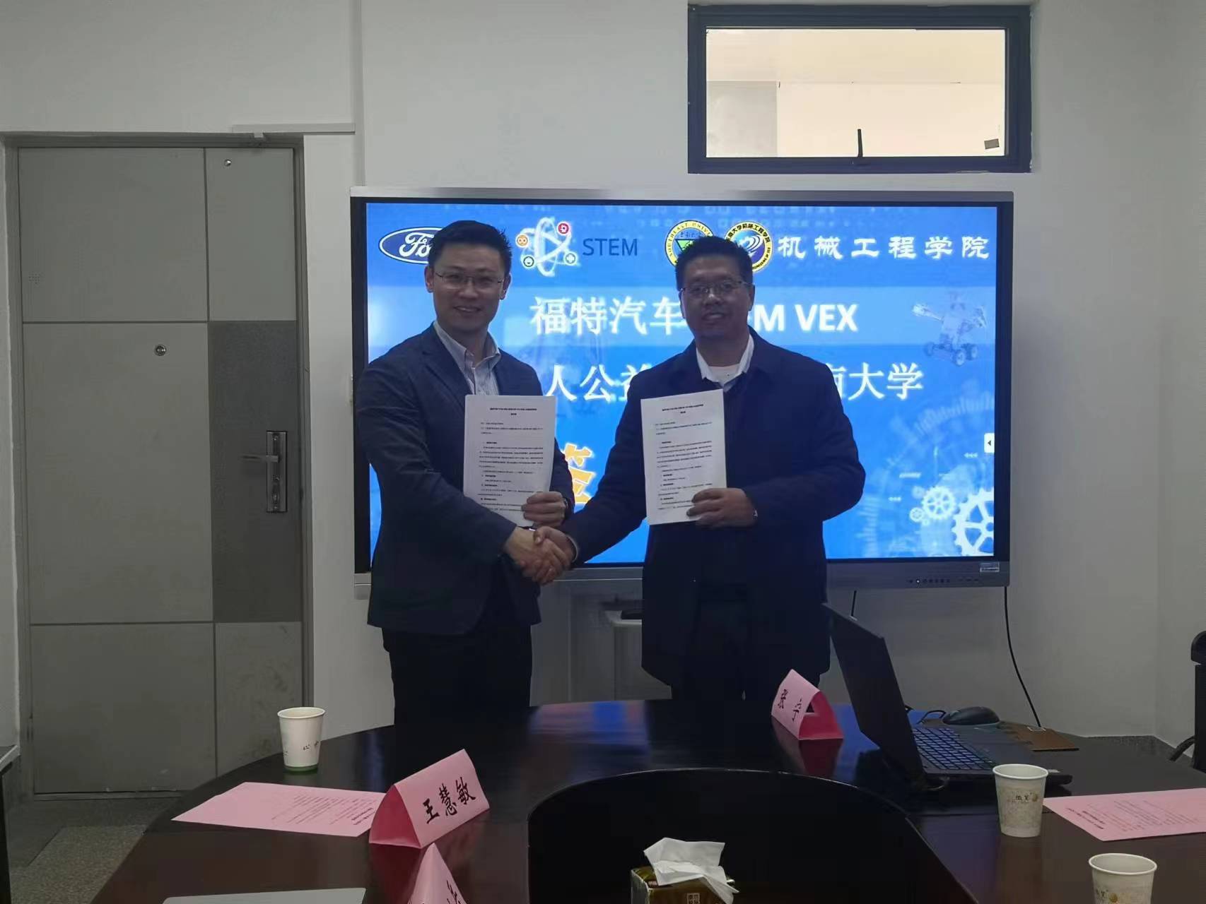 2023年4月4日上午,福特汽车STEM VEX机器人公益项目落户太阳集团tyc33455官网签约仪式在太阳集团tyc33455官网工业发展与培训中心会议室举行。福特汽车项目总监李仲炜先生、福特汽车STEM机器人公益项目代表于天龙先生、江苏省VEX赛事负责人王慧敏先生、南师附中江宁分校VEX机器人竞赛负责人陈小兵主任、太阳集团tyc33455官网工业发展与培训中心陈建松主任、交通公司道路与铁道工程系杨顺新教授等出席,太阳集团tyc33455官网相关专业指导老师参加了仪式。仪式由陈建松主任主持。