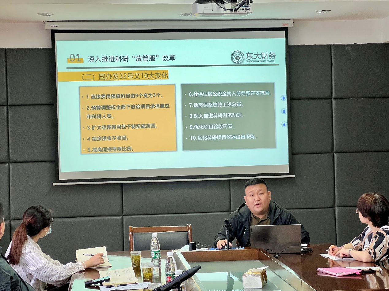 交流期间,专项资金管理科任明旭科长介绍了有关科研经费管理最新政策以及相关管理服务流程,财务一科仇维昌科长介绍了有关财务报销最新政策,经费使用等情况,之后双方在科研经费政策、经费使用、办事流程等方面与财务处进行深入研讨。