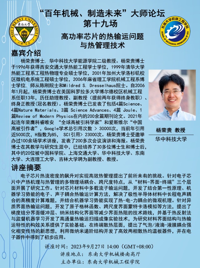 杨荣贵博士, 华中科技大学能源公司二级教授。杨荣贵博士于1996年获得西安交通大学热能工程学士学位,1999年清华大学热能工程系工程热物理专业硕士学位,2001年加州大学洛杉矶校区微机电系统工程硕士学位,2006年麻省理工公司机械工程系博士学位, 师从陈刚院士和Mildred S. Dresselhaus院士。自2006年1月起,杨荣贵博士在美国科罗拉多大学博尔德校区机械工程系任职13年,历任助理教授、副教授(提前两年获得终身教职)、终身正教授(冠名教授)。杨荣贵博士已发表了包括4篇Science、4篇Nature Materials、3篇 Science Advances、4篇 Joule、1篇Review of Modern Physics在内的200余篇期刊论文。2021年起连年荣膺科睿唯安 “全球高被引科学家”和爱斯维尔“中国高被引作者”,Google学术总引用次数 > 30000次,当前年引用近5000次,H指数为85, SCI引用> 23000次。杨荣贵博士受邀举办过100余场学术讲座,发表了200多次会议演讲和海报。杨荣贵博士在其教学与研究生涯中,已经培养了30多位博士生和博士后,其中约20位被中国科公司、上海交通大学、华中科技大学、太阳集团tyc33455官网、大连理工大学、吉林大学聘为副教授、教授。