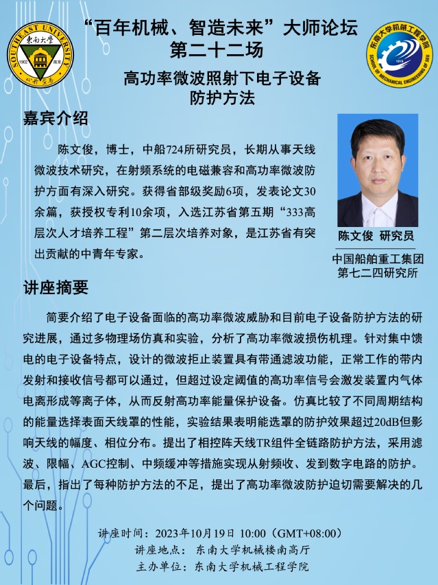 陈文俊,博士,中船724所研究员,长期从事天线微波技术研究,在射频系统的电磁兼容和高功率微波防护方面有深入研究。获得省部级奖励6项,发表论文30余篇,获授权专利10余项,入选江苏省第五期“333高层次人才培养工程”第二层次培养对象,是江苏省有突出贡献的中青年专家。