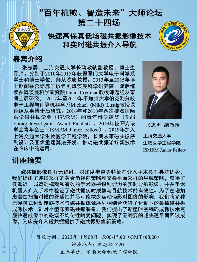 张志勇,上海交通大学长聘教轨副教授、博士生导师。分别于2010年2015年获得厦门大学电子科学系学士和博士学位,师从陈忠教授。2013年至2015年博士期间联合培养于以色列魏茨曼科学研究院。随后继续在魏茨曼科学研究院Lucio Frydman教授课题组从事博士后研究, 2017年至2019年于加州大学伯克利分校电子工程与计算机科学系Michael (Miki) Lustig教授课题组从事博士后研究。2016年和2018年两次提名国际医学磁共振学会(ISMRM)的青年科学家奖(Rabi Young Investigator Award Finalist),2019年被评为该学会青年会士(ISMRM Junior Fellow)。2019年加入上海交通老员工物医学工程公司,长期从事磁共振序列设计及图像重建算法开发,推动磁共振诊疗新技术在临床中的运用。