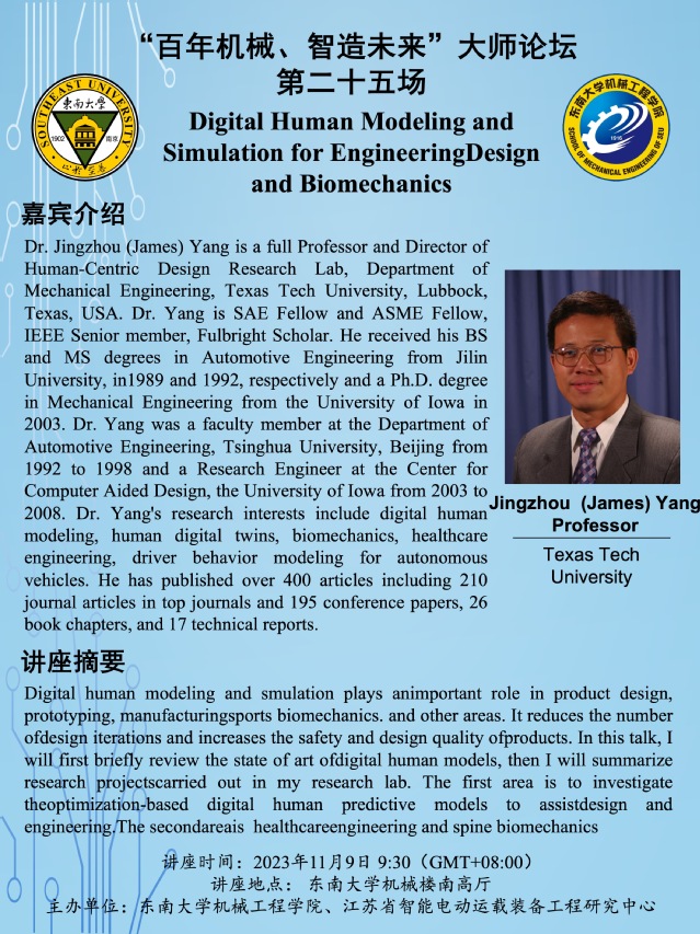 Dr. Jingzhou (James) Yang is a full Professor and Director of Human-Centric Design Research Lab, Department of Mechanical Engineering, Texas Tech University, Lubbock, Texas, USA. Dr. Yang is SAE Fellow and ASME Fellow, IEEE Senior member, Fulbright Scholar. He received his BS and MS degrees in Automotive Engineering from Jilin University, in 1989 and 1992, respectively and a Ph.D. degree in Mechanical Engineering from the University of Iowa in 2003. Dr. Yang was a faculty member at the Department of Automotive Engineering, Tsinghua University, Beijing from 1992 to 1998 and a Research Engineer at the Center for Computer Aided Design, the University of Iowa from 2003 to 2008. Dr. Yang's research interests include digital human modeling, human digital twins, biomechanics, healthcare engineering, driver behavior modeling for autonomous vehicles. He has published over 400 articles including 210 journal articles in top journals and 195 conference papers, 26 book chapters, and 17 technical reports.