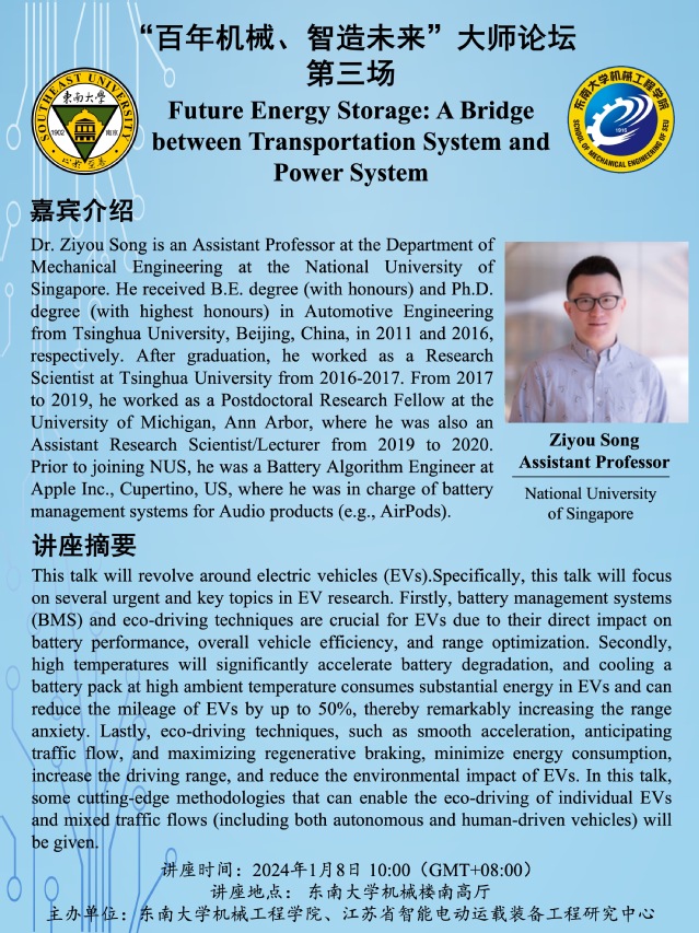 Dr. Ziyou Song is an Assistant Professor at the Department of Mechanical Engineering at the National University of Singapore. He received B.E. degree (with honours) and Ph.D. degree (with highest honours) in Automotive Engineering from Tsinghua University, Beijing, China, in 2011 and 2016, respectively. After graduation, he worked as a Research Scientist at Tsinghua University from 2016-2017. From 2017 to 2019, he worked as a Postdoctoral Research Fellow at the University of Michigan, Ann Arbor, where he was also an Assistant Research Scientist/Lecturer from 2019 to 2020. Prior to joining NUS, he was a Battery Algorithm Engineer at Apple Inc., Cupertino, US, where he was in charge of battery management systems for Audio products (e.g., AirPods).