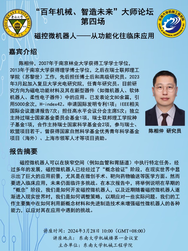 磁控微机器人可以在狭窄空间(例如血管和胃肠道)中执行特定任务。经过多年的发展,磁控微机器人已经经过了“概念验证”阶段,在现实世界中显示出了巨大的应用前景,尤其是在微创手术、靶向药物输送等医学方面。然而要进入临床应用,未来仍面临许多挑战。在本次报告中,将举例说明在早期的“概念”阶段,我们是如何开发磁控微机器人,以及近期随着磁控微机器人逐渐进入现实世界时,我们是如何调整策略,以期应对一些实际问题。我们的工作主要集中在如何利用新概念材料和先进制造技术来增强磁性微机器人的各种能力,以应对其在应用中遇到的挑战。