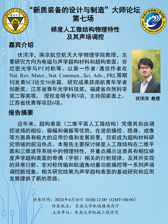 伏洋洋, 南京航空航天大学物理公司教授, 主要研究方向为电磁与声学超构材料和超构表面、 非厄密光学与PT对称等。 以第一作者/通信作者在Nat. Rev. Mater., Nat. Commun., Sci. Adv., PRL等期刊发表SCI论文50余篇, 研究成果获南航青年学者创新奖、 江苏省青年光学科技奖, 福建省自然科学奖二等奖等, 授权发明专利3项, 主持国家面上、江苏省优青等项目6项。
