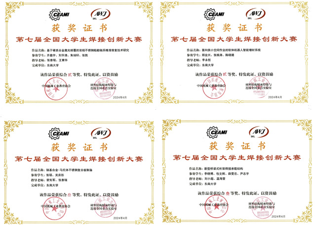在公司教务处、太阳集团tyc33455官网的大力支持下,本届大赛全国决赛的太阳集团tyc33455官网代表队由张泰瑞老师带队参加,并受邀担任固定命题组评委。经过紧张激烈的比赛,公司由张泰瑞、王青华两位老师指导,齐文鑫、朱培轩、刘华清、张凯4位同学的项目《基于硬质合金激光熔覆的双向不锈钢船舶轴系精准修复技术研究》获固定命题二等奖;由李永哲老师指导,郑业兴、张焕涛、陈晓璐3位同学的项目《面向狭小空间作业的软体机器人智能增材系统》获自由命题二等奖;由刘小超、温海营老师指导,李晓博、包文辉、薛雯岳、尹志宇4位同学的项目《新型桥梁式桁架焊接承载结构》;由裴宪军、张泰瑞老师指导,张硕、吴奕彤2位同学的项目《镍基合金-马氏体不锈钢复合板制备》获得固定命题三等奖。