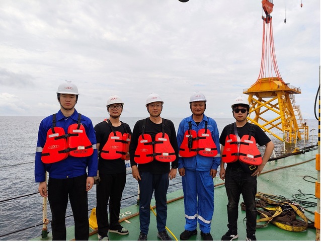 本次夜间作业海况复杂、光线不足且水质浑浊,蛙人等传统水下观测方式严重受限,甚至无法正常工作。在上述恶劣条件下,联合团队利用最新研制的水下增强观测系统对导管架施工核心环节--导管架插桩施工过程进行全程跟踪和偏差修正数据实时反馈,保障插桩过程在十几分钟内一步到位,在确保施工质量的同时大大提升了施工效率和安全。