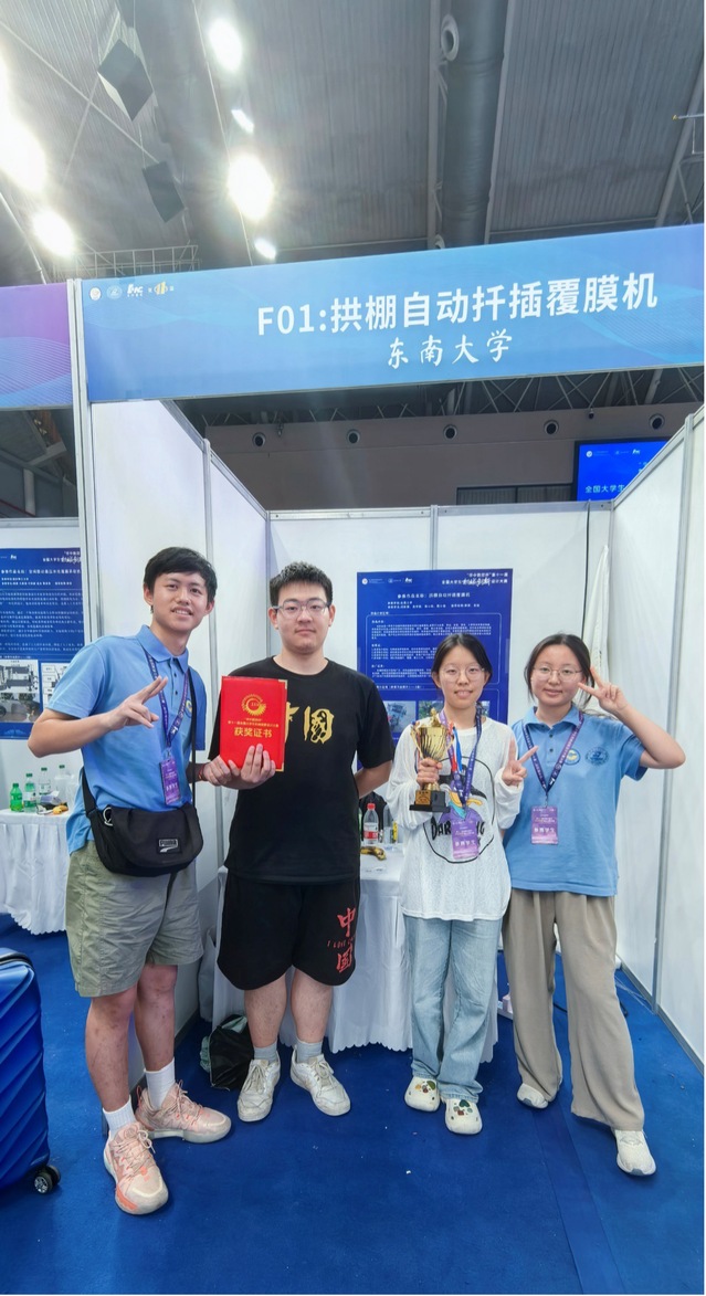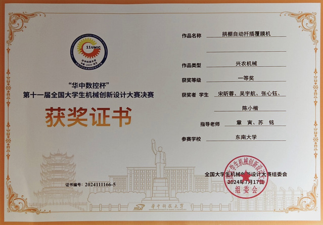 7月17日,“华中数控杯”第十一届全国老员工机械创新设计大赛决赛在华中科技大学落下帷幕。机械学子宋昕蓉、吴宇航、张心钰和陈小楷组成的参赛队伍,在章寅和苏铭老师的指导下,凭借《拱棚自动扦插覆膜机》作品喜获全国一等奖(最高奖)!王郑、豆文欢、杜煜成和王子阳同学在王玉娟和毕可东老师指导下完成的《蝴蝶东南飞》作品获得全国三等奖。