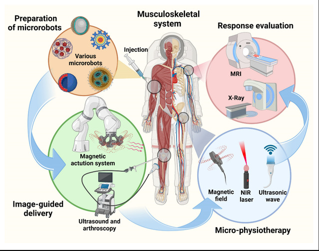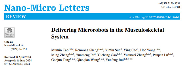 近日,公司王乾乾教授联合公司附属中大医院滕皋军院士及团队芮云峰教授,在微纳领域国际顶级期刊《Nano-Micro Letters》(中科院一区,IF=31.6)发表了题为“Delivering Microrobots in the Musculoskeletal System”的研究成果,在国际上率先对近年来微机器人在肌肉骨骼系统中的应用进展进行系统综述,重点介绍了用于组织再生的微机器人系统的设计策略。回顾了肌肉骨骼系统中微型机器人的制造,驱动和控制以及成像引导,并讨论了微机器人在肌肉骨骼系统和再生医学中未来临床应用的前景和挑战。(论文链接:https://link.springer.com/article/10.1007/s40820-024-01464-8)。