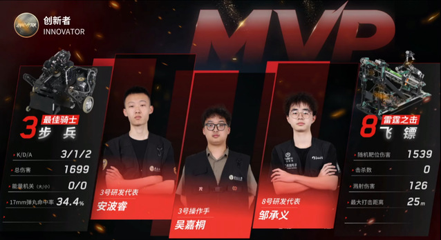 特别值得一提的是,战队中的3号轮腿步兵机器人在比赛中表现非常突出,其灵活性与打击精度赢得了观众的认可,并受邀参与了全明星赛环节,进一步展示了其技术实力。这一成就不仅是对战队技术创新的肯定,也是对其努力与付出的回报。