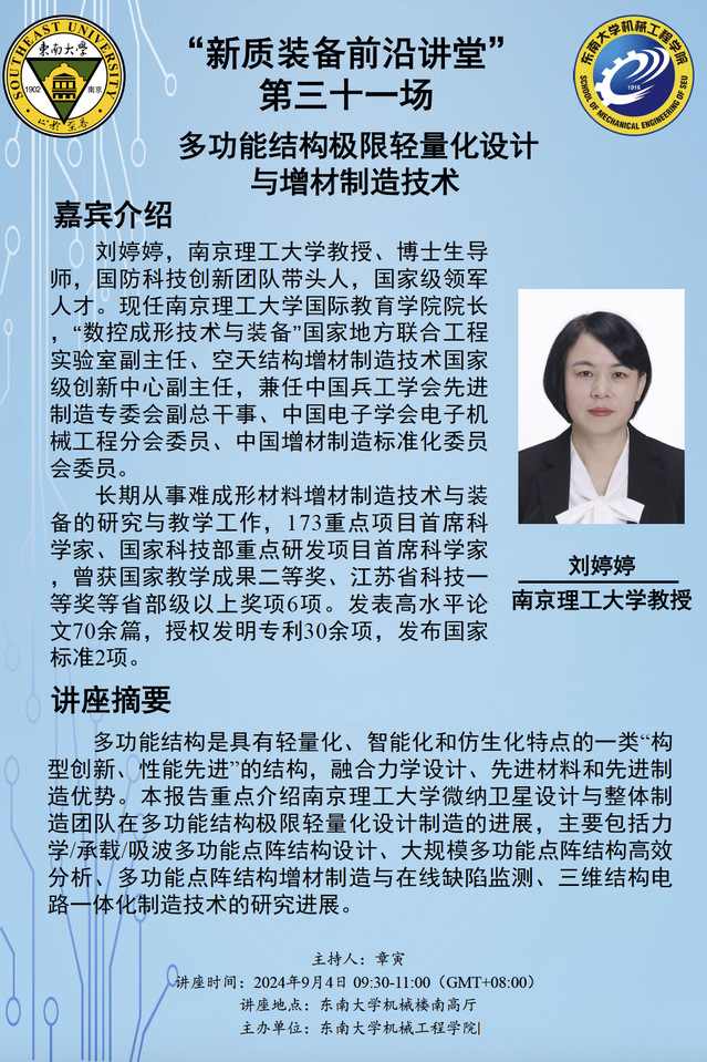 多功能结构是具有轻量化、智能化和仿生化特点的一类“构型创新、性能先进”的结构,融合力学设计、先进材料和先进制造优势。本报告重点介绍南京理工大学微纳卫星设计与整体制造团队在多功能结构极限轻量化设计制造的进展,主要包括力学/承载/吸波多功能点阵结构设计、大规模多功能点阵结构高效分析、多功能点阵结构增材制造与在线缺陷监测、三维结构电路一体化制造技术的研究进展。