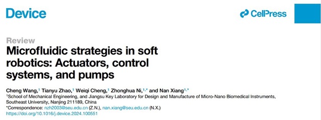 近日,公司项楠教授/倪中华教授团队在微流控技术促进软体机器人自主化、无绳化和智能化方面取得重要进展,研究系统回顾了微流控技术在软致动器、软控制系统和软泵等软体机器人学关键领域的广泛应用和最新进展,揭示了微流控与软体机器人学高度相关的技术体系和相辅相成的发展规律,相关成果以“Microfluidic Strategies in Soft Robotics: Actuators, Control Systems, and Pumps”为题发表在《Cell》旗下新期刊《Device》上。