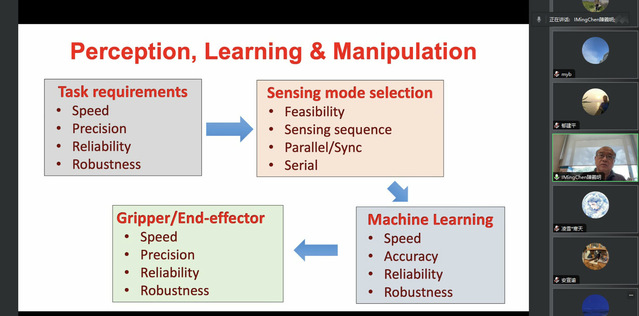 近年来,工业机器人系统广泛用于制造业、物流行业和医疗行业。将工业机器人(机械臂)应用到这些行业中的关键技术包括感知和机器学习技术。9月13日,新加坡工程院院士南洋理工大学I-Ming Chen(陈义明)教授,IEEE和ASME Fellow,应邀为公司师生就 “制造、物流和医院供应系统中的感知和学习”进行了线上学术讲座。本次讲座由公司窦建平老师主持,吸引了线上和线下师生的热情参与。