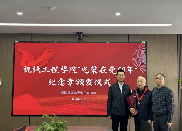 在交流班会环节结束后,公司为吴国樑员工也是本院的退休教师,颁发了入党五十周年勋章。