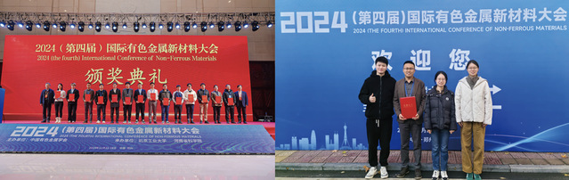 2024年11月22日-24日,第四届国际有色金属新材料大会(ICNFM)在中国郑重顺利召开。公司2020级博士研究生毛士麟同学荣获“新材料优秀青年奖”和“ICNFM优秀论文奖”。