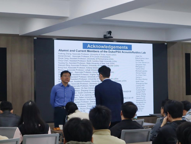 讲解环节结束后,参会师生积极与黄教授进行学术交流互动,黄教授细致地回答了关于声流控技术未来发展方向的问题,并给出建设性的见解。