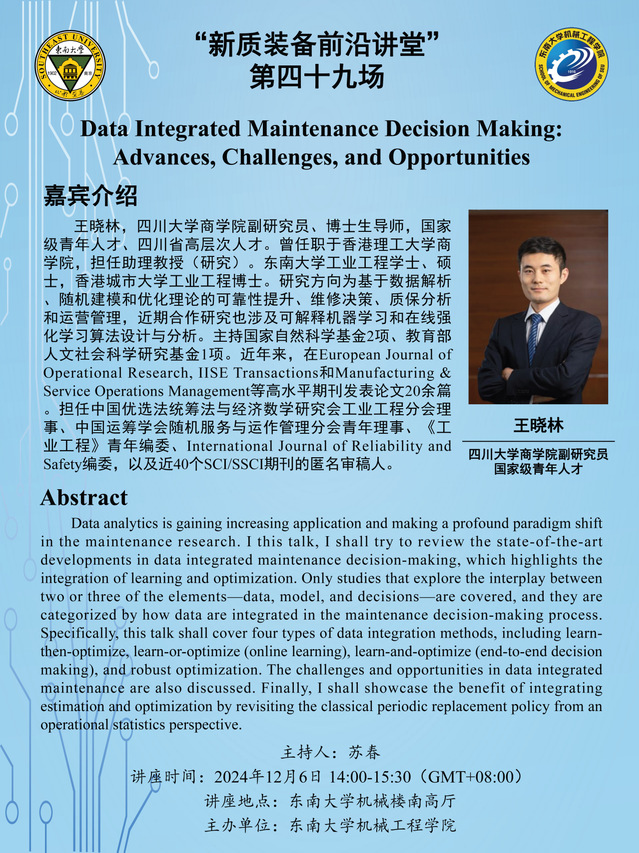 “新质装备前沿讲堂”第四十九场:王晓林研究员— Data Integrated Maintenance Decision Making: Advances, Challenges, and Opportunities