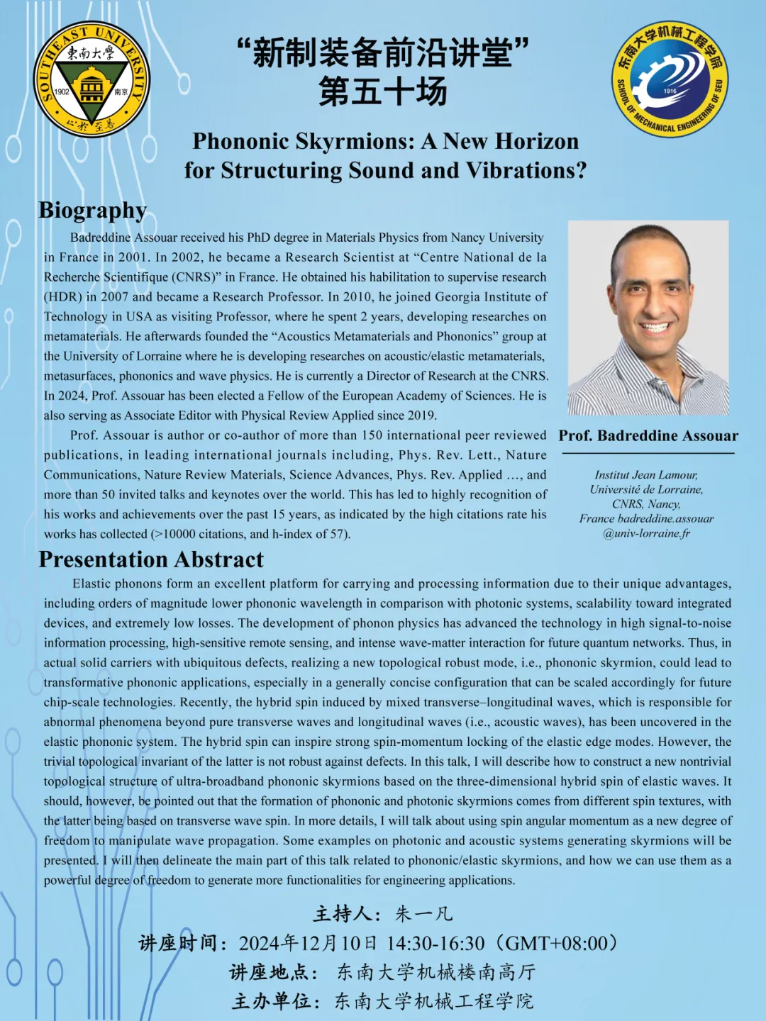 Badreddine Assouar received his PhD degree in Materials Physics from Nancy University in France in 2001. In 2002, he became a Research Scientist at “Centre National de la Recherche Scientifique (CNRS)” in France. He obtained his habilitation to supervise research (HDR) in 2007 and became a Research Professor. In 2010, he joined Georgia Institute of Technology in USA as visiting Professor, where he spent 2 years, developing researches on metamaterials. He afterwards founded the “Acoustics Metamaterials and Phononics” group at the University of Lorraine where he is developing researches on acoustic/elastic metamaterials, metasurfaces, phononics and wave physics. He is currently a Director of Research at the CNRS. In 2024, Prof. Assouar has been elected a Fellow of the European Academy of Sciences. He is also serving as Associate Editor with Physical Review Applied since 2019.