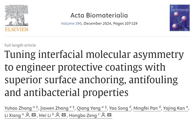 近日,公司2023级硕士研究生张宇浩在生物材料期刊《Acta Biomaterialia》(中科院一区,IF=9.4)发表题为“Tuning Interfacial Molecular Asymmetry to Engineer Protective Coatings with Superior Surface Anchoring, Antifouling and Antibacterial Properties”的研究成果,设计了一种稳定防污抗菌的分子不对称结构涂层用于保护植入式生物医学设备。(论文链接:https://doi.org/10.1016/j.actbio.2024.10.015)