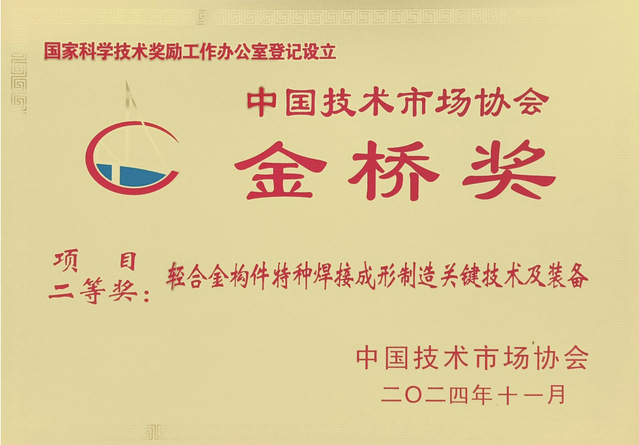 2024年12月12-14日,第十二届中国技术市场协会金桥奖励大会暨第十一届中国科技服务业论坛在北京友谊宾馆召开,公司机械制造系刘小超副教授牵头、联合山东大学申报的“轻合金构件特种焊接成形制造关键技术与装备”项目荣获二等奖。