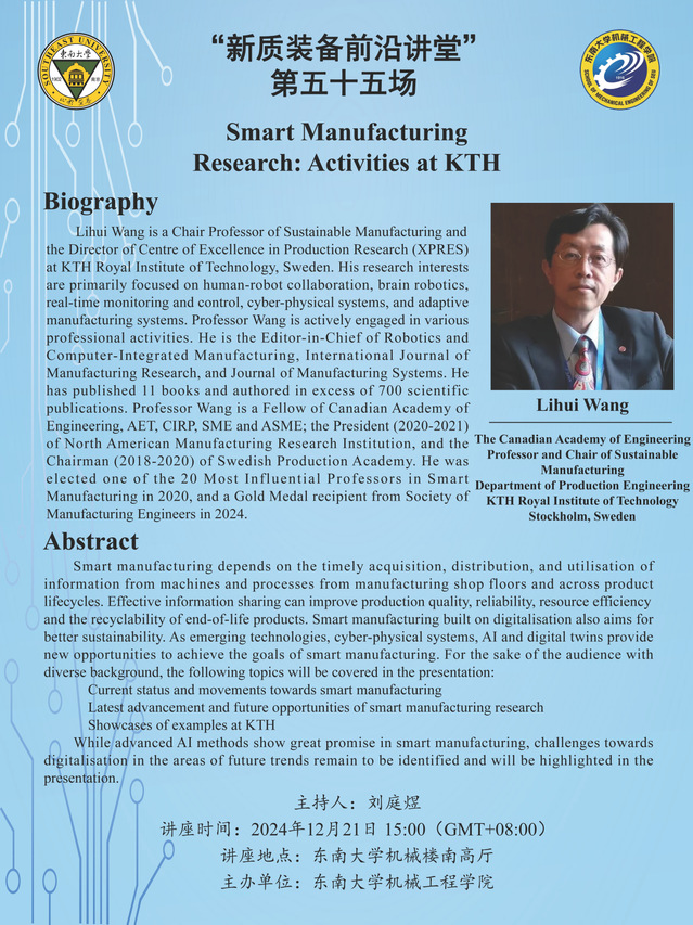 Lihui Wang is a Chair Professor of Sustainable Manufacturing and the Director of Centre of Excellence in Production Research (XPRES) at KTH Royal Institute of Technology, Sweden. His research interests are primarily focused on human-robot collaboration, brain robotics, real-time monitoring and control, cyber-physical systems, and adaptive manufacturing systems. Professor Wang is actively engaged in various professional activities. He is the Editor-in-Chief of Robotics and Computer-Integrated Manufacturing, International Journal of Manufacturing Research, and Journal of Manufacturing Systems. He has published 11 books and authored in excess of 700 scientific publications. Professor Wang is a Fellow of Canadian Academy of Engineering, AET, CIRP, SME and ASME; the President (2020-2021) of North American Manufacturing Research Institution, and the Chairman (2018-2020) of Swedish Production Academy. He was elected one of the 20 Most Influential Professors in Smart Manufacturing in 2020, and a Gold Medal recipient from Society of Manufacturing Engineers in 2024.