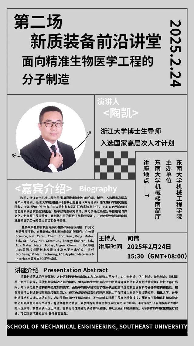 陶凯,浙江大学太阳集团tyc33455官网/杭州国际科创中心研究员,博导,入选国家高层次青年人才计划,浙江大学杭州国际科创中心副主任(双专计划)兼未来科学研究院副经理,浙江-爱尔兰生物有机电介质材料与器件联合实验室主任,浙江-以色列自组装功能材料联合实验室副主任;原子级制造研究领域,致力于通过操控分子自组装与阵列化,制备原子尺度精准、客制化形性的超分子结构/元器件,并以此设计制造面向精准生物医学工程的自组装功能器件装备;主要从事生物有机自组装形性协同制造与调控、阵列化与跨尺度序构、自组装电介质材料与软器件等研究;在包括Science, Nat. Catal., Chem. Soc. Rev., Prog. Mater. Sci., Sci. Adv., Nat. Commun., Energy Environ. Sci., Adv. Mater., Mater. Today, Angew. Chem. Int. Ed.等在内的国际权威期刊上发表众多高水平学术论文;担任Bio-Design & Manufacturing, ACS Applied Materials & Interfaces等多本SCI期刊编辑。