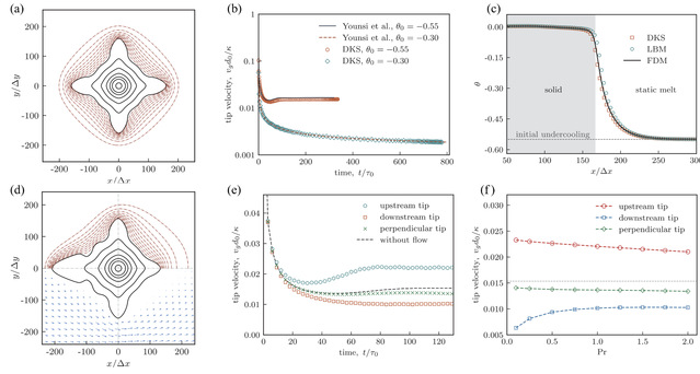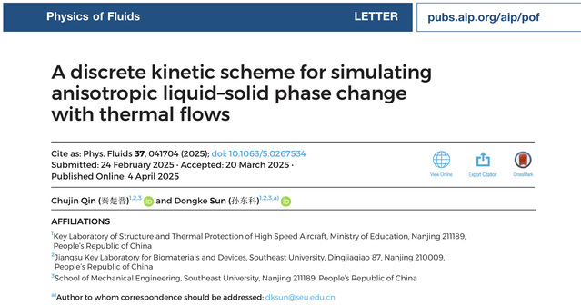 近日,公司2022级直博生秦楚晋在热对流作用下枝晶生长建模方面取得新进展,相关研究成果以“A discrete kinetic scheme for simulating anisotropic liquid-solid phase change with thermal flows”为题发表在《Physics of Fluids》(流体物理学,PoF)。该期刊是流体力学领域的权威期刊之一,自1958年创刊以来,PoF始终致力于发表流体动力学领域的高质量原创研究,涵盖理论分析、数值模拟和实验探索,是美国物理联合会AIP旗下JCR一区、中科院二区期刊。