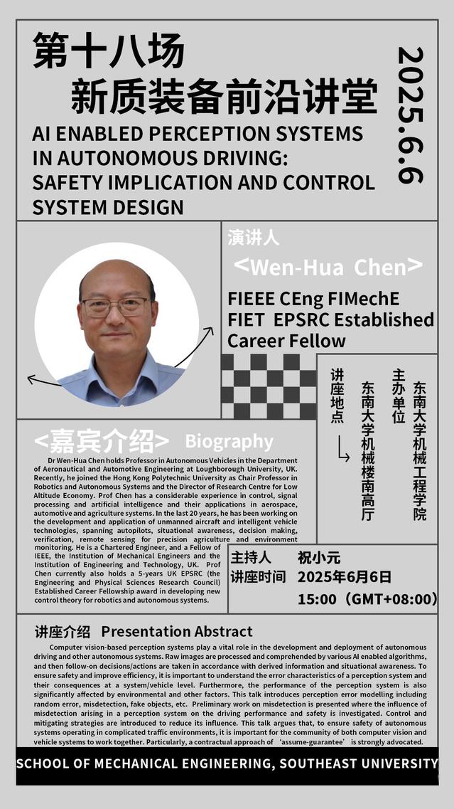 2025年机械公司“新质装备前沿讲堂”第十八场:Prof. Wen-Hua Chen——AI Enabled Perception Systems in Autonomous Driving:Safety Implication and Control System Design