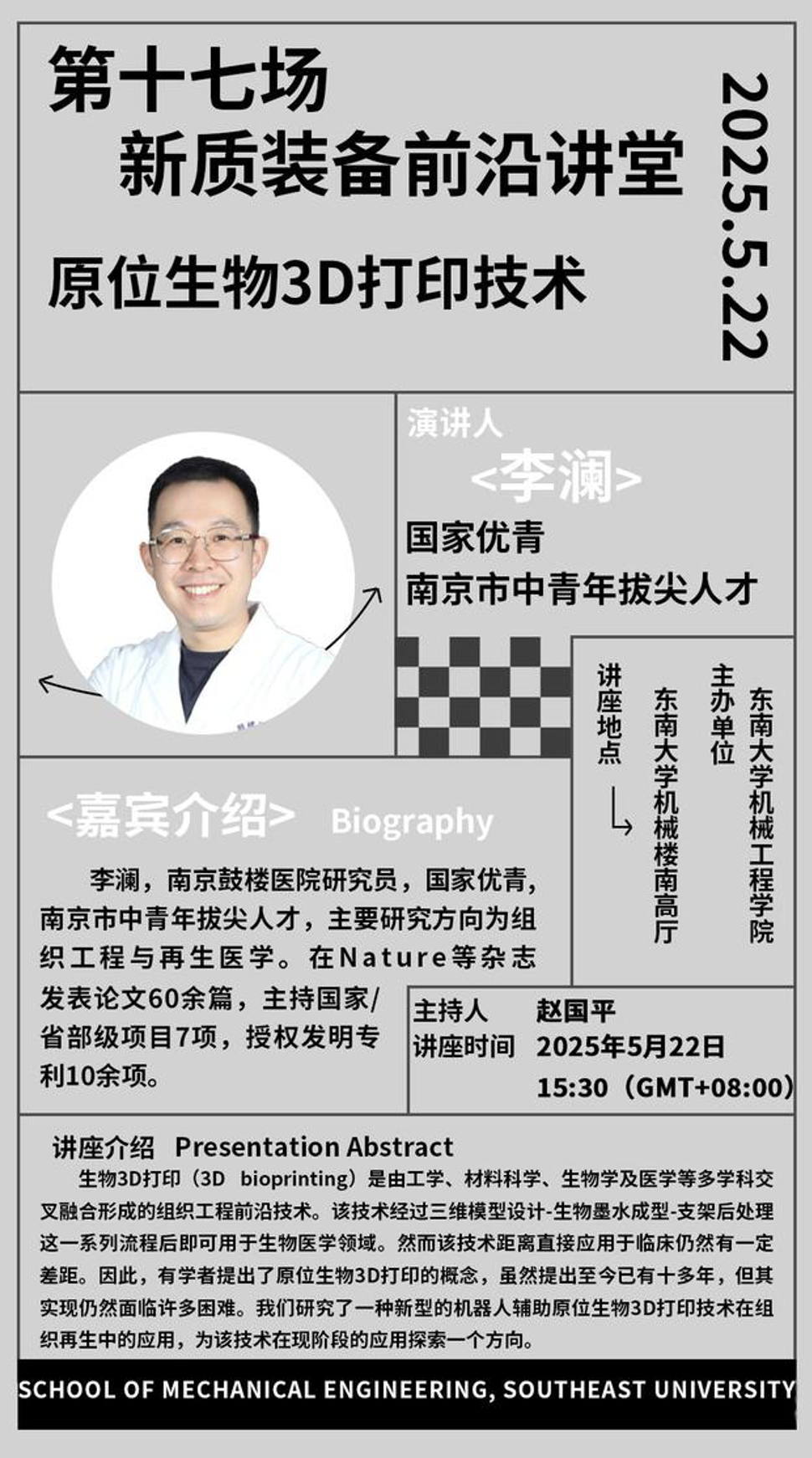 5月22日,国家优青、南京市中青年拔尖人才、南京鼓楼医院研究员李澜应邀来公司就“原位生物3D打印技术”主题开展学术讲座。李澜研究员分享了团队在组织工程与再生医学方向研究的进展,重点讨论了原位生物3D打印技术的关键问题,并介绍了目前主流的原位生物3D打印机器人结构形式和控制方法。本次讲座由赵国平副研究员主持,公司相关研究领域的师生参与本次讲座。