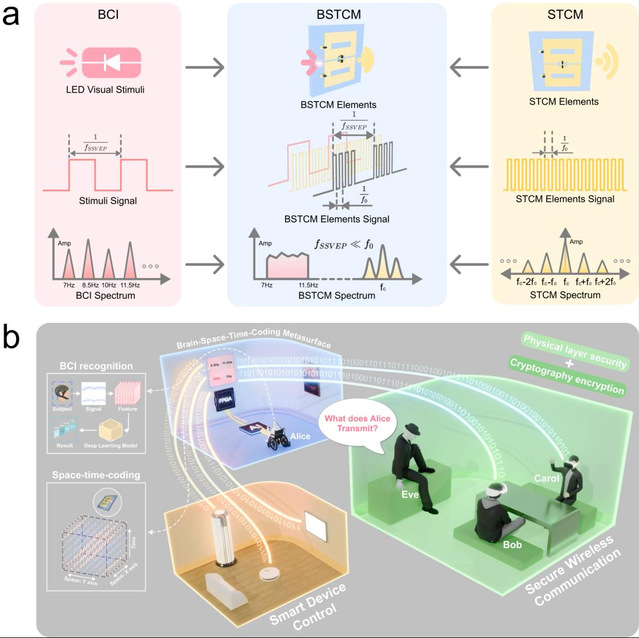 图2基于脑机时空编码超表面的安全无线通信和意念控制设备的概念图